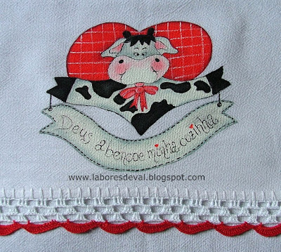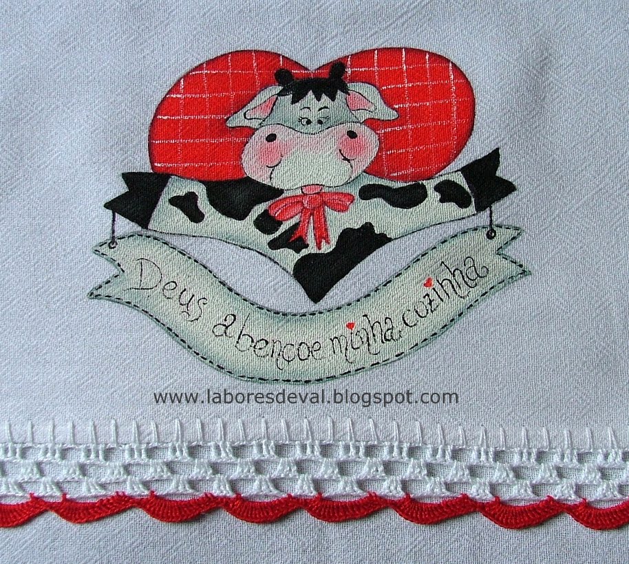 PANO DE PRATO PINTADO. Mais um trabalho com técnica PINTURA COUNTRY. Alguns dizem pintura folk, outros country e agora também pintura patch. O que vale mesmo é a graciosidade do resultado final e também porque facilita a pintura no tecido de algodão. Utilizo o chamado "pé de galinha", um saco de algodão de primeira linha, branquinho e que pronto tem o tamanho 45x65 aproximadamente. Não sou muito arteira para os biquinhos de crochê mas vão saindo. Este é bem simples mas harmonizou-se com a pintura.